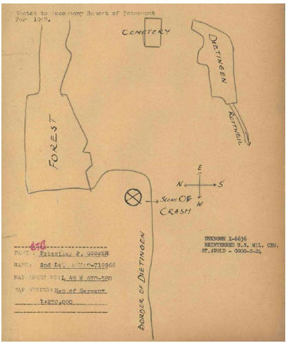 According to German Military records Sebastian Schürle stayed with the deceased pilot and subsequently placed his remains in the coffin. Mayor Ohnmacht’s report shows that the funeral took place at 8 p.m. on 23 February, with Sebastian Schuerle, Matthäus Schmuck, Mathäus Beck and Franz Ohnmacht in attendance. Though, the old Dietingen parish cemetery burial registers state that his funeral took place at seven in the evening on February 24, 1945 in the Municipal cemetery, top right corner of the burial ground of the nursing home. According to the minutes of the council meeting held on 06.10.1945 Master Carpenter Bantle of Irslingen presented the community of Dietingen with a bill for the pine coffin of the downed American airman. On 18 July 1946, he was reinterred in St. Avoid cemetery pending a decision from the family about where to bury him. When the military authorities were unable to make contact with his father the government decided to reinter him at the American cemetery in Belgium in May 1950.